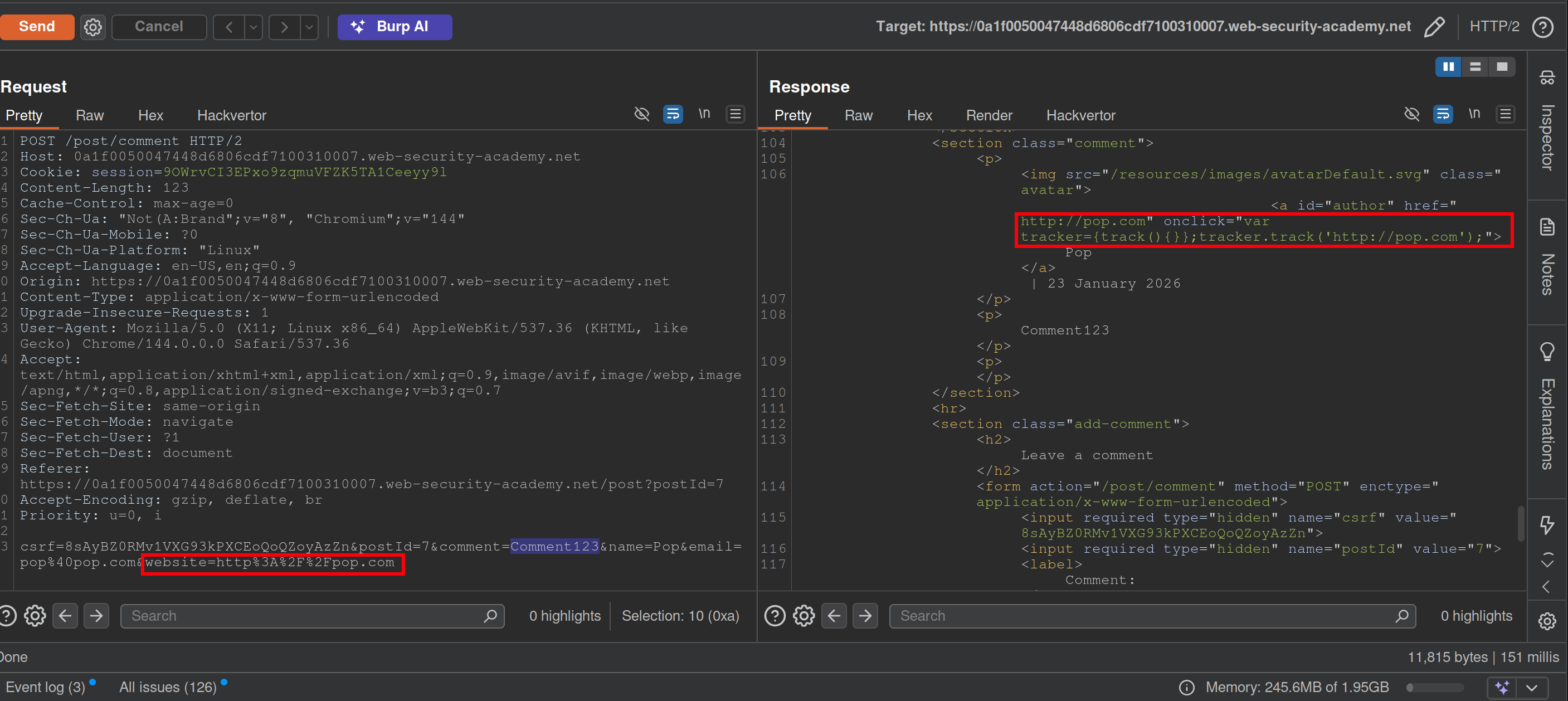 This one was pretty complicated, it involved realizing that a notification cookie in a response to the /post/comment endpoint was being set, along with a “Invalid email address:” string to the /post?postId=<x> endpoint. So the goal was to: