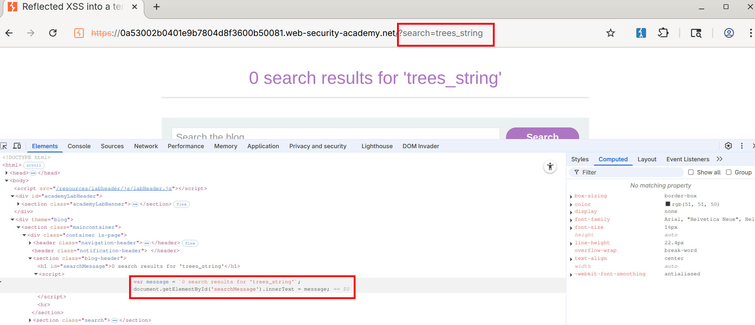 https://0adb0045036e5ed2816fa37900770042.web-security-academy.net/?SearchTerm="-alert(1)-"test1