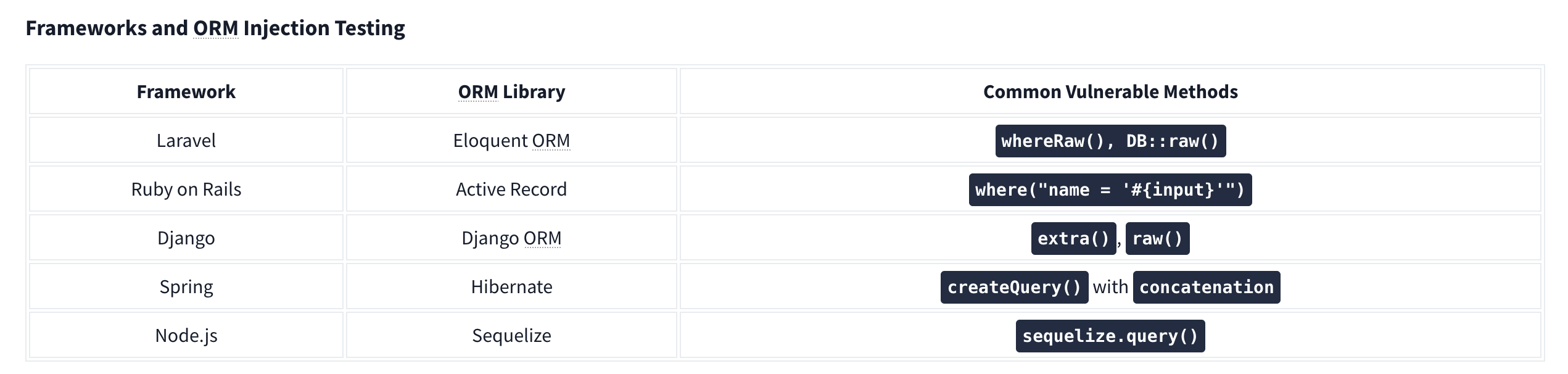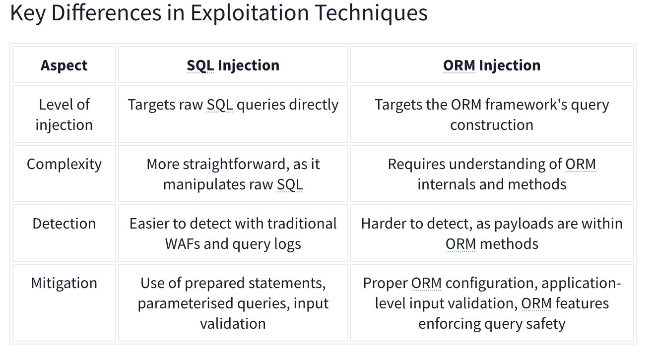 - ORM injection: Targets the ORM framework, exploiting how it constructs queries from object operations. Attackers manipulate the ORM’s methods and properties to influence the resulting SQL queries.